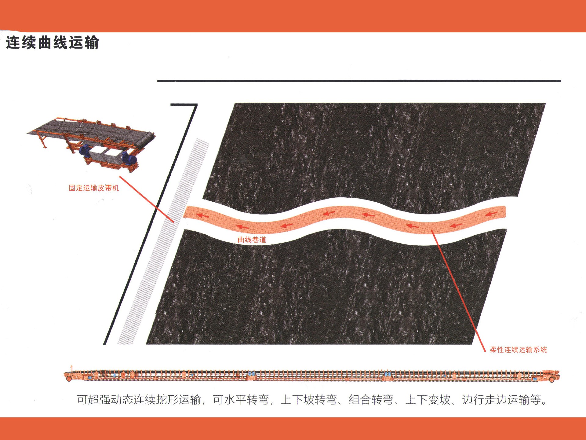 可超强动态连续蛇形运输,可水平转弯,上下坡转弯,组合转弯,上下变坡,边行边运输等。